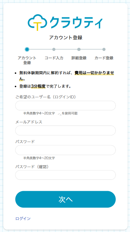 - クラウティ無料体験は下記ボタンから画面通りに必要項目を入力すれば完了