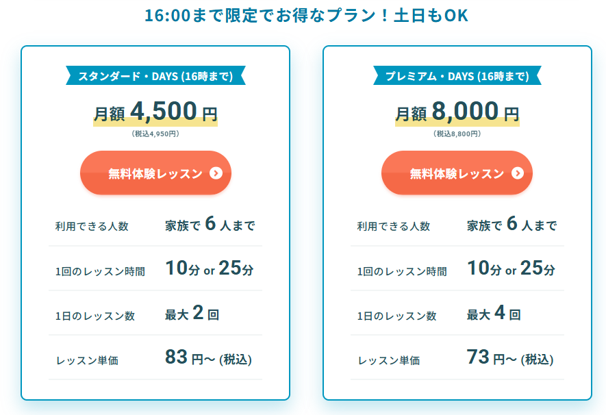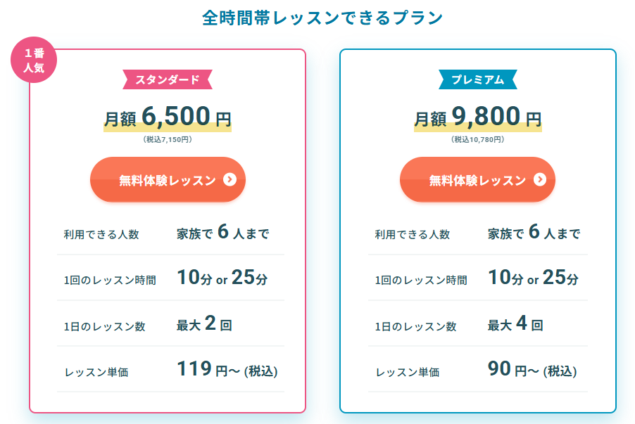 月額6,500円で毎日「10分のレッスン×2回」または「25分のレッスン×1回」を受講できる