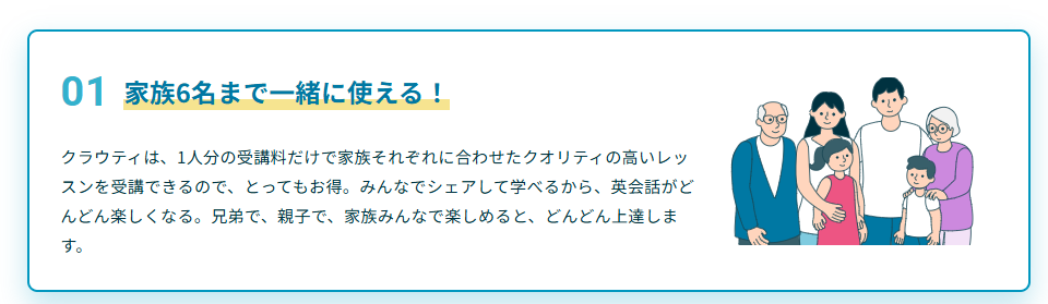 しかも、クラウティでは1人分の受講料で家族6人までレッスンのシェアが可能です!