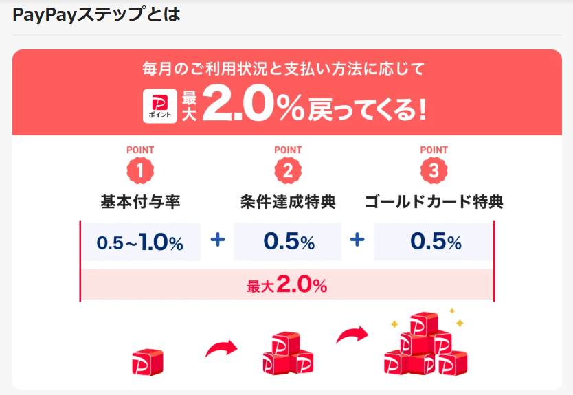 下記の条件達成で、PayPayカードなら最大1.5%、PayPayカードゴールドなら最大2.0%のポイント還元に!
