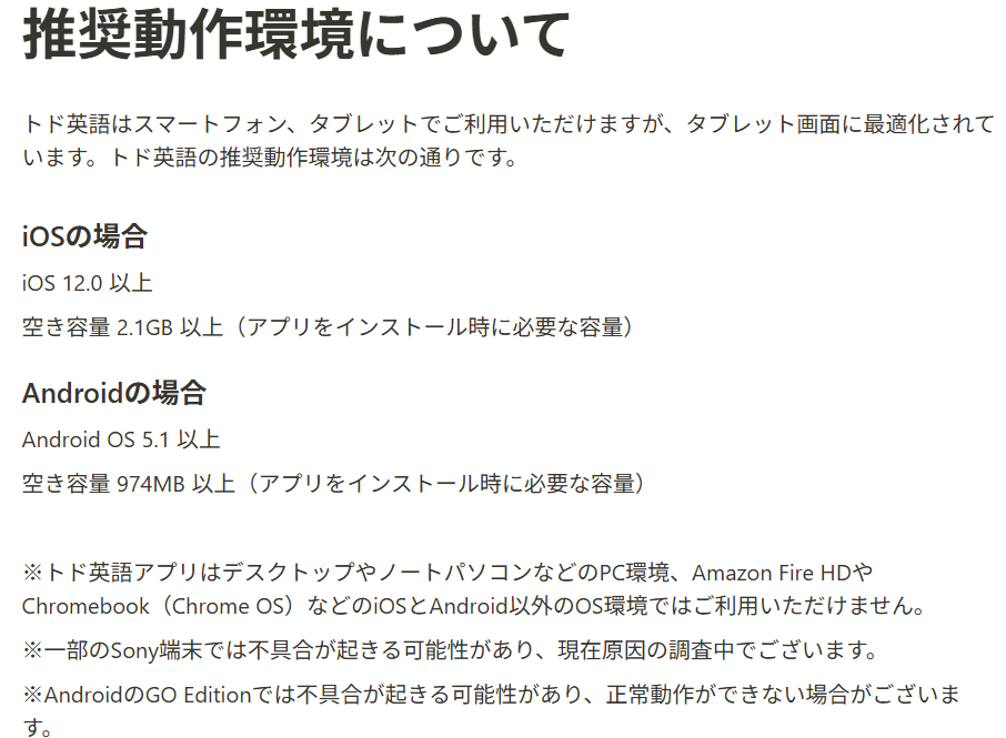 なお、我が家ではAmazon fire HDタブレットで問題なくトド英語を利用していますが、トド英語公式ではAmazon fire HDタブレットは推奨されていません。